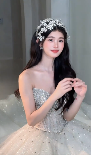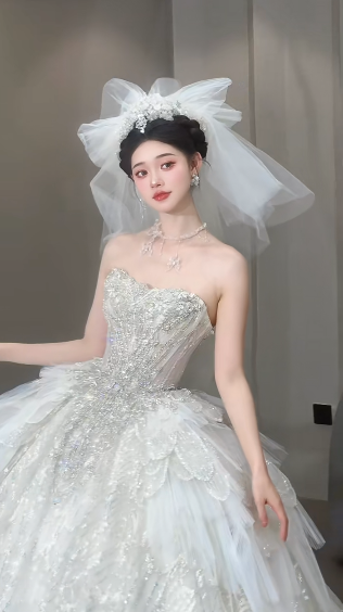 Dreamy Ball Gown Strapless Tulle Sequin Beaded With Veil Long Wedding Dresses C4066
