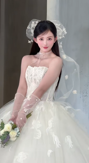 Dreamy Ball Gown Strapless Tulle Applique With Veil Long Wedding Dresses C4056
