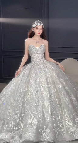 Glitter Ball Gown Strapless Tulle Sequin Long Wedding Dresses C4062