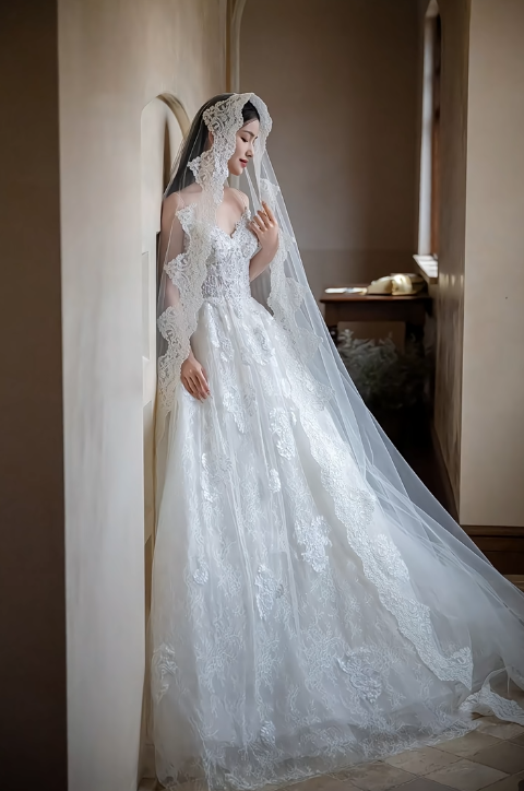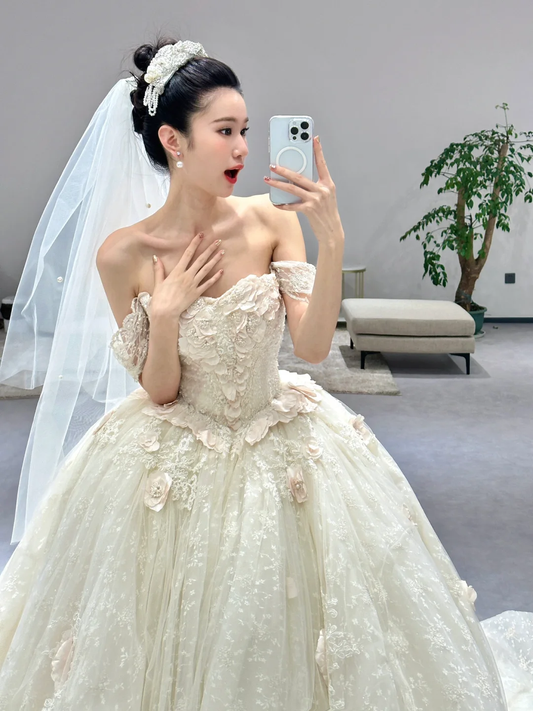 Dreamy Ball Gown Off The Shoulder Tulle Lace Applique With Veil Long Wedding Dresses C3967