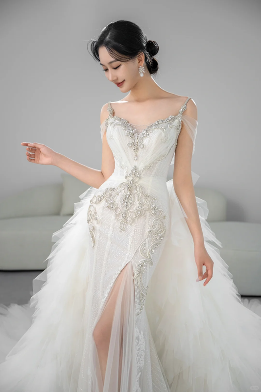Unique Mermaid Spaghetti Straps Tulle Beaded Long Wedding Dresses C3960
