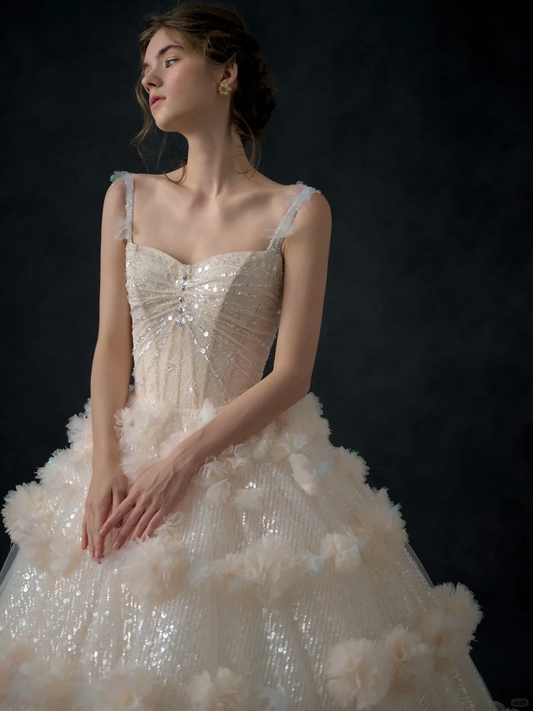 Princess Ball Gown Spaghetti Straps Champagne Tulle Sequin Long Wedding Dresses C3966