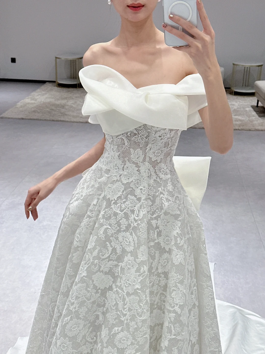 Dreamy Ball Gown Off The Shoulder Satin Tulle Lace Long Wedding Dresses C3972