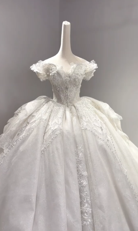Timeless Ball Gown Off The Shoulder Tulle Lace Beaded Long Wedding Dresses C3989