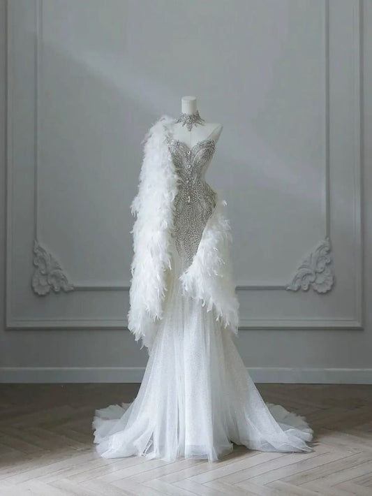 Chic Mermaid Strapless Sequin White Long Wedding Dresses With Feather C3505
