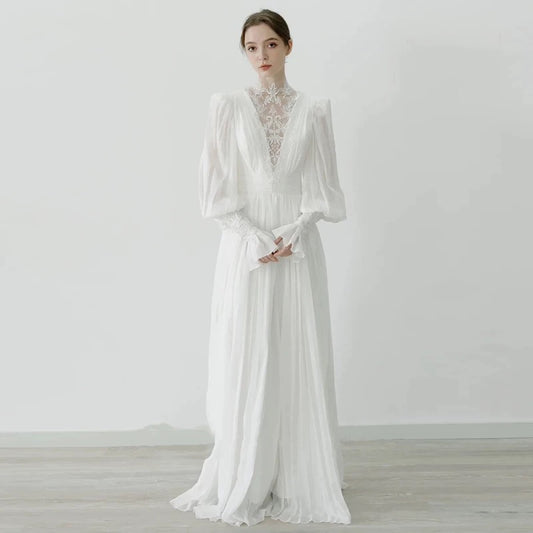Chic A line High Neckline Lace Long Sleeves White Wedding Dresses C1679