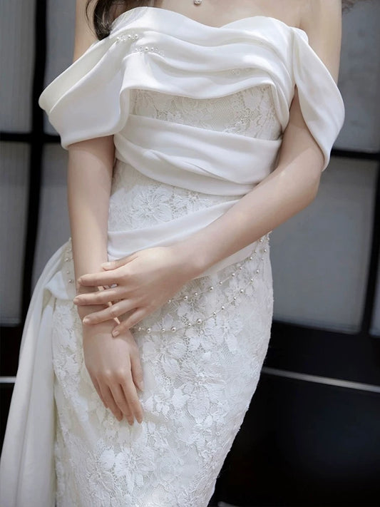 Sexy Sheath Off The Shoulder Lace Long White Wedding Dresses With Ribbon C1685