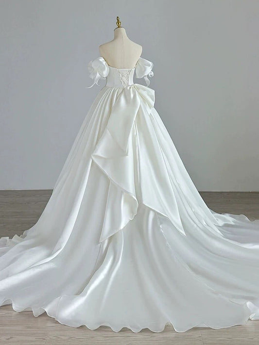 Simple Ball Gown Sweetheart Satin Long White Wedding Dresses With Bow C1788
