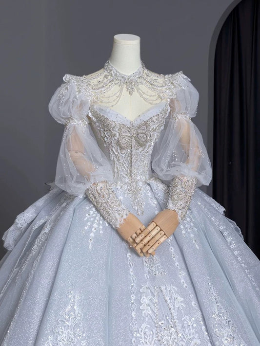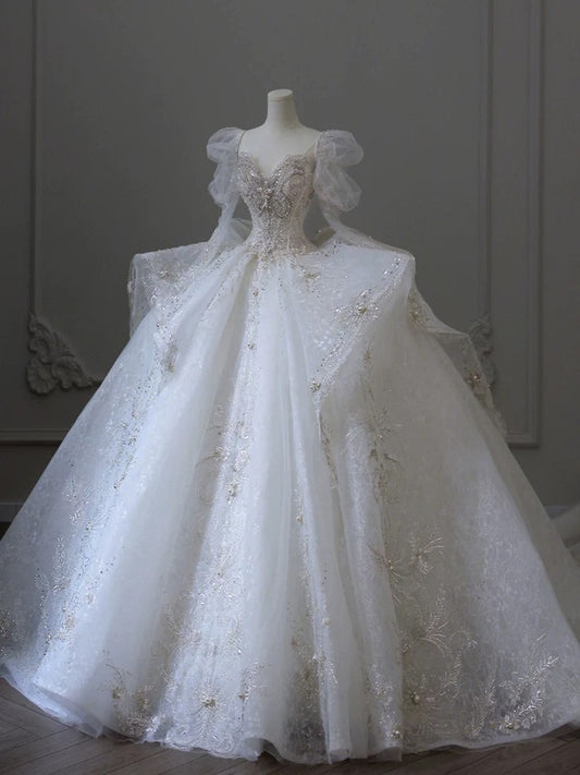 Dreamy Ball Gown Sweetheart Long Puffy Sleeves Lace Wedding Dresses With Beads C1798