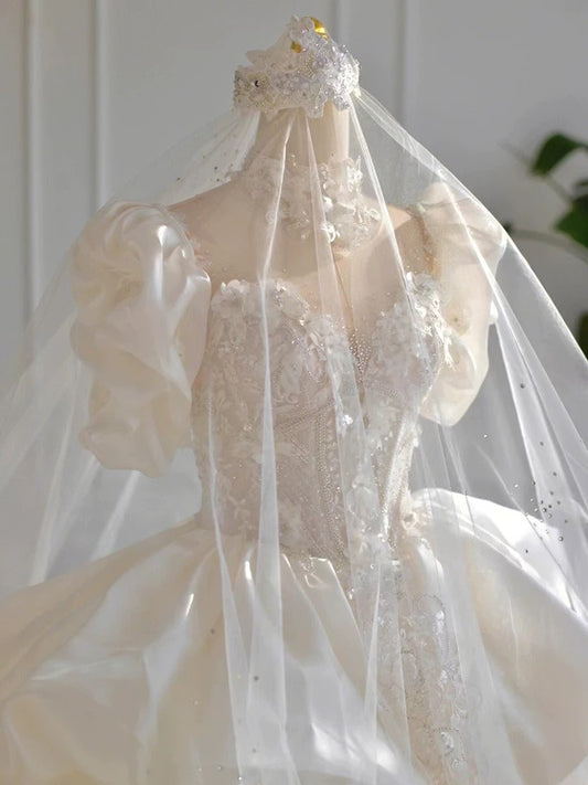Dreamy Ball Gown High Neckline Short Sleeves White Lace Wedding Dresses With Beads C1796