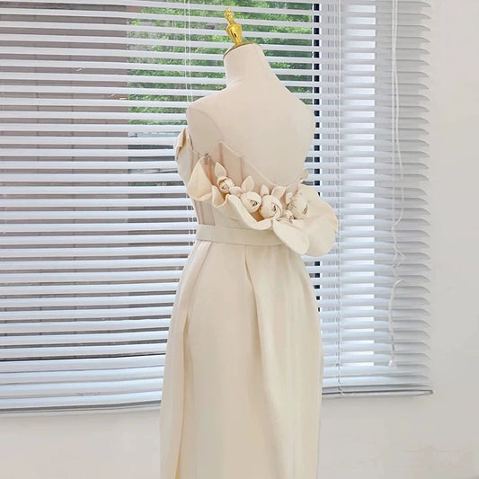 Classy Sheath Strapless Satin Ankle Length Wedding Dresses With Flowers C1634