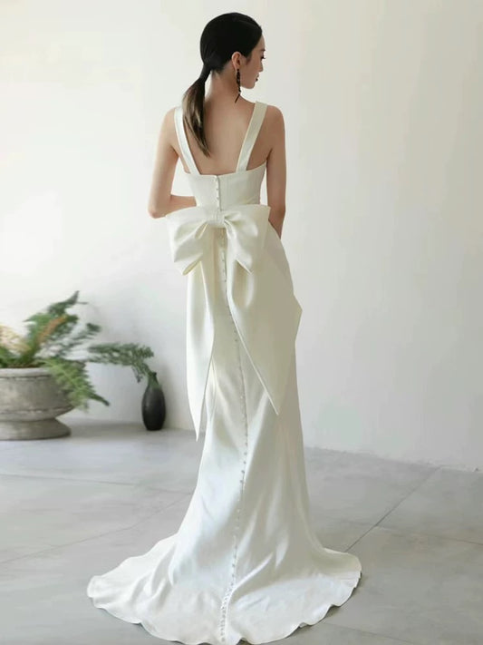 Timeless Mermaid Strapless Long Satin White Wedding Dresses With Bow C1638