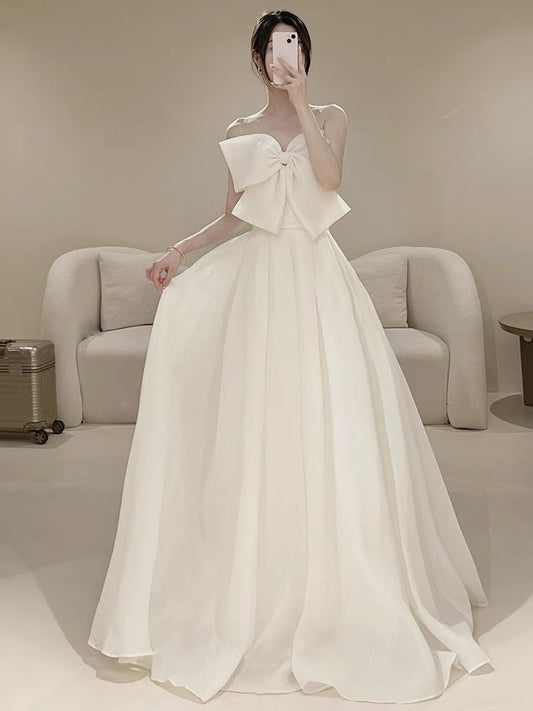 Timeless A line Strapless Long Satin White Wedding Dresses With Bow C1664