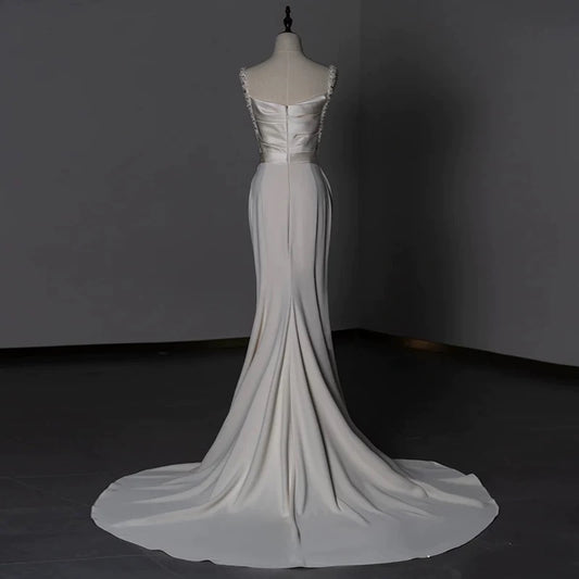 Timeless Sheath Straps Long Satin White Wedding Dresses With Beads C1665