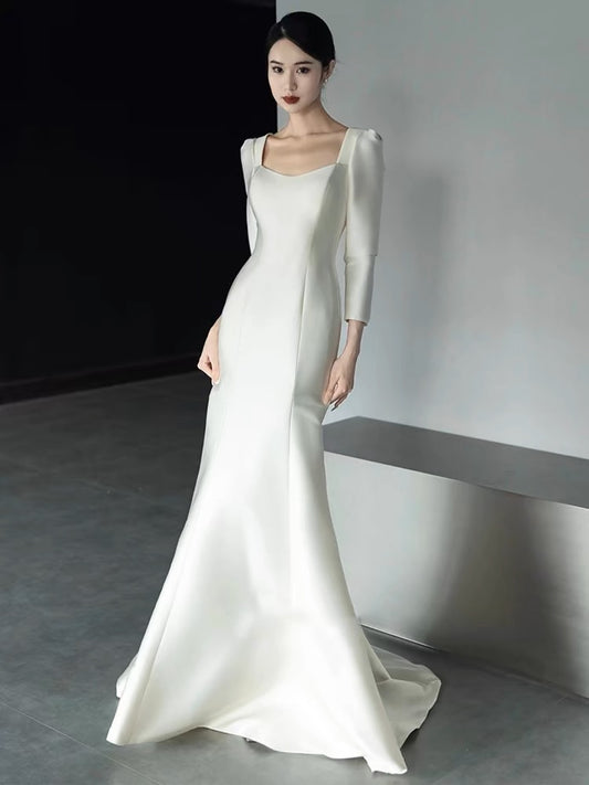 Unique Mermaid Square Neckline Long Sleeves White Satin Wedding Dresses CC1670
