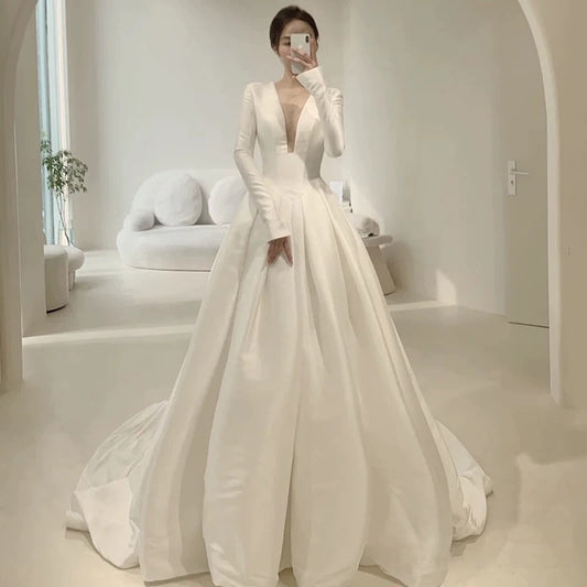Unique A line V Neckline Long Sleeves Satin White Wedding Dresses CC1671