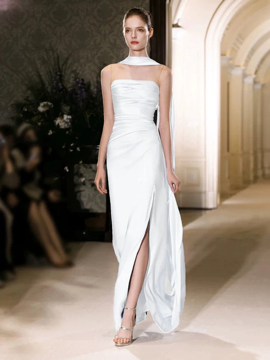 Unique Sheath Strapless Satin Slit White Wedding Dresses With Ribbon C1672