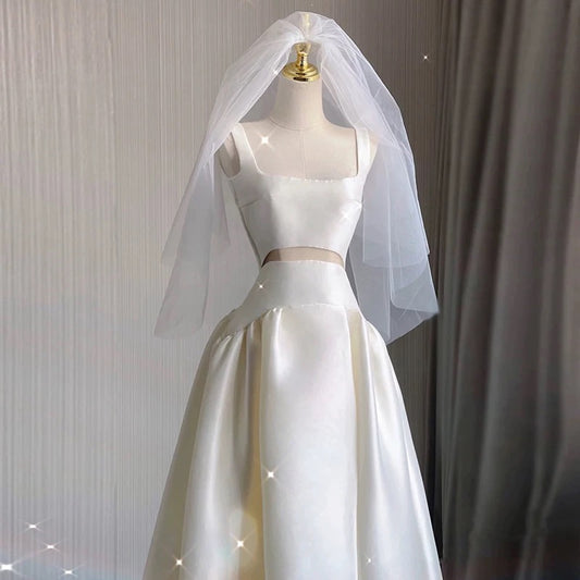 Unique High Low Straps Satin Long White Wedding Dresses C1675
