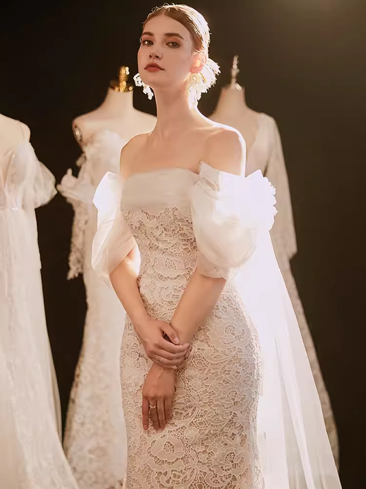 Vintage Mermaid Strapless Lace Wedding Dress With Short Sleeves C1456