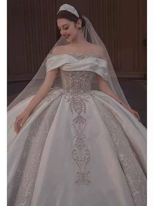 Luxury Ball Gown Off The Shoulder Short Sleeves Satin Wedding Dress C172