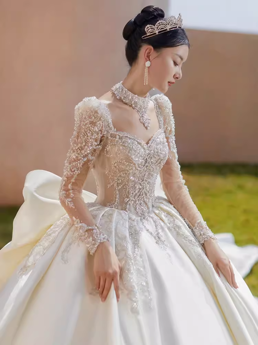 Luxury Ball Gown High Neckline Long Sleeves Lace White Wedding Dress C178