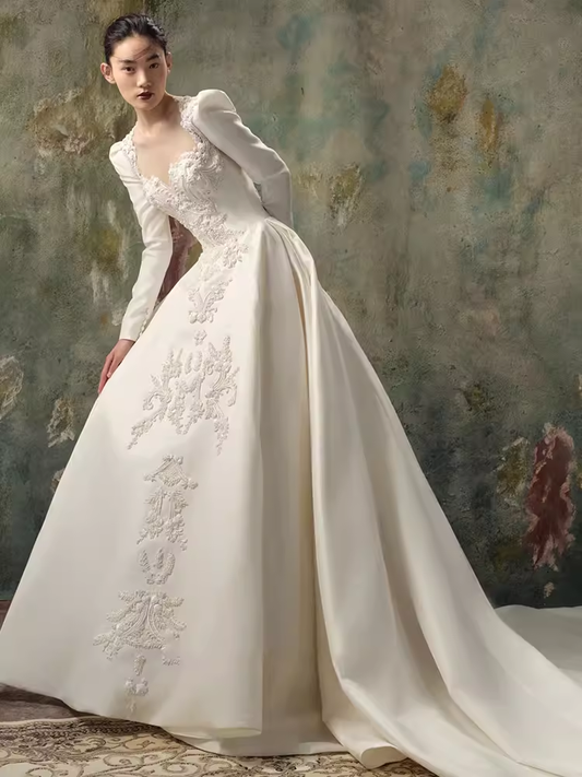 Vintage Ball Gown Square Neckline White Satin Wedding Dress C162