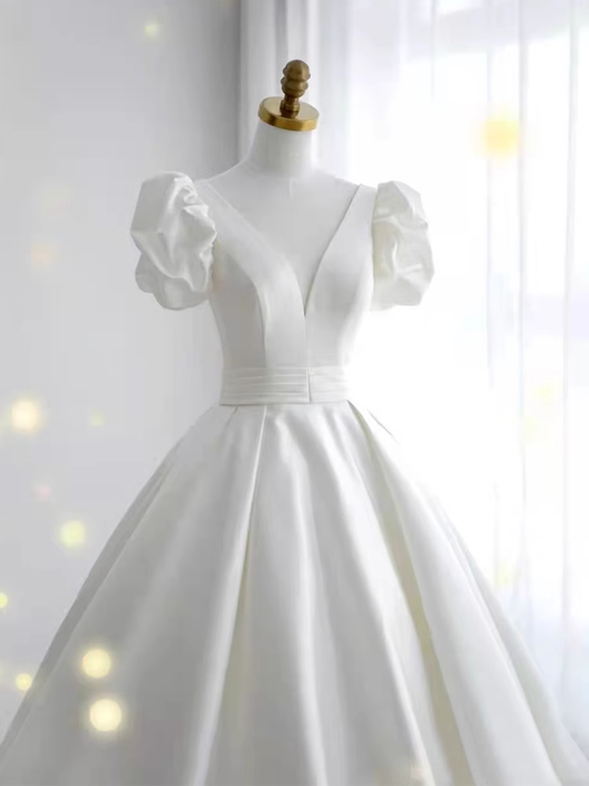 Vintage Ball Gown V neckline White Satin Long Wedding Dresses B091
