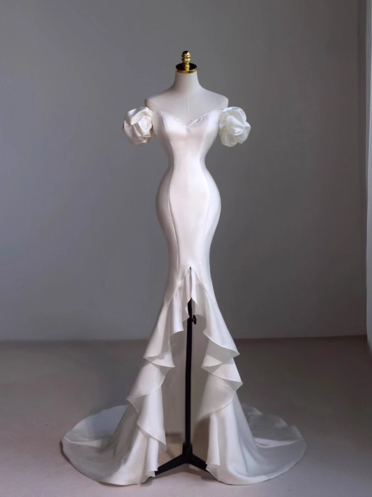 Vintage Mermaid Off the Shoulder Short Sleeves White Satin Wedding Dresses B087