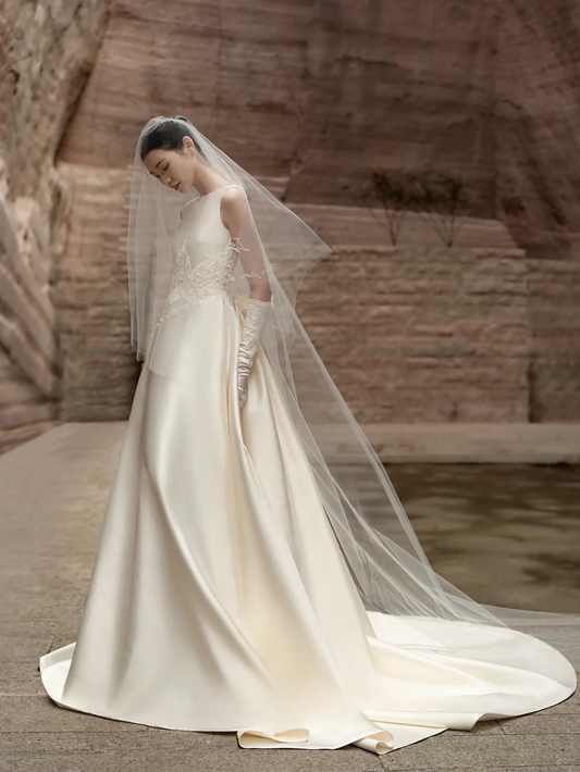 Dreamy A Line Satin Applique Backless With Gloves Veil Long Wedding Dresses C4290