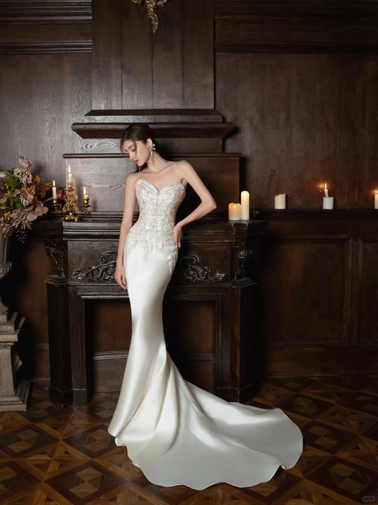 Timeless Mermaid Strapless Satin Sequin Beaded Long Wedding Dresses C4304