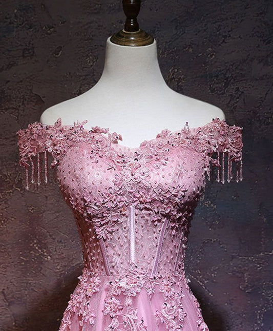Robe de soirée vintage en tulle rose à épaules dénudées et ligne A C1172