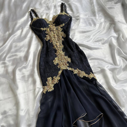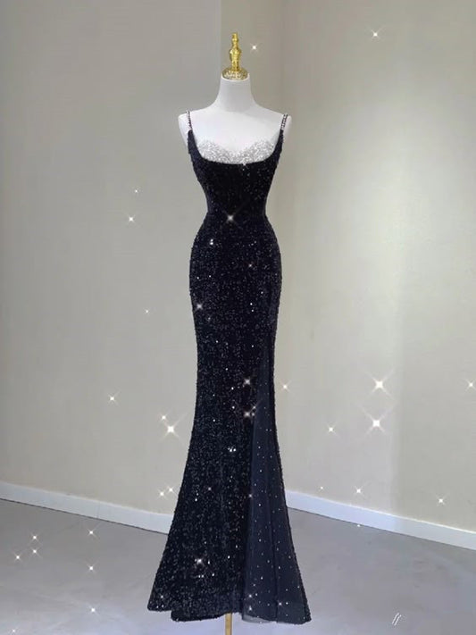 Robe de soirée noire à paillettes et bretelles spaghetti avec jolie gaine C2798