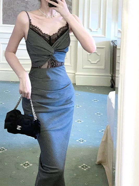 Robe de soirée longue et sexy à bretelles spaghetti et gaine grise C2402