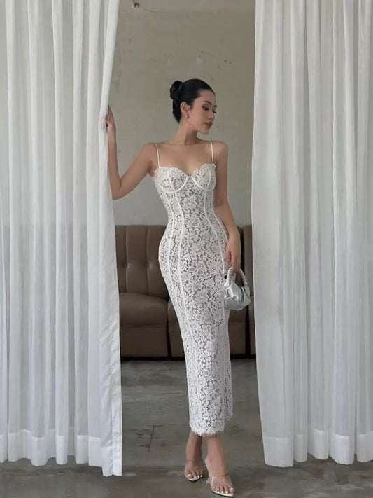 Robe de soirée sexy à bretelles spaghetti en dentelle blanche, longueur cheville, robe de bal, C2403