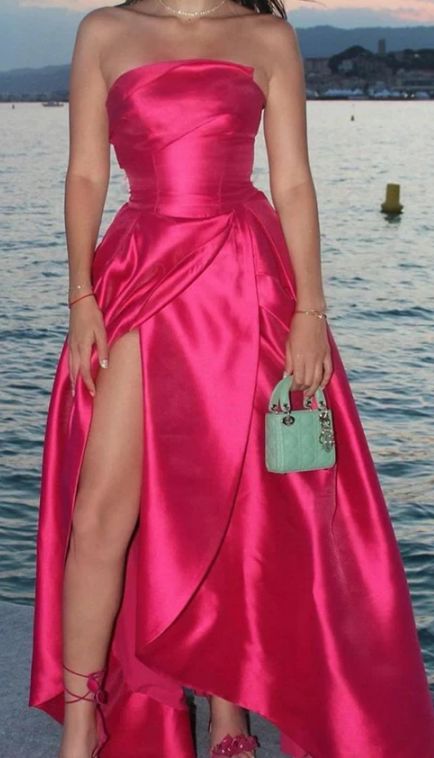 Robe de bal longue en satin rose vif sans bretelles avec fente C2585
