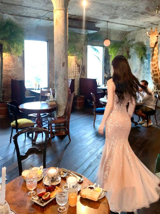 Jolie robe de bal longue sirène à bretelles spaghetti et sequins C2365