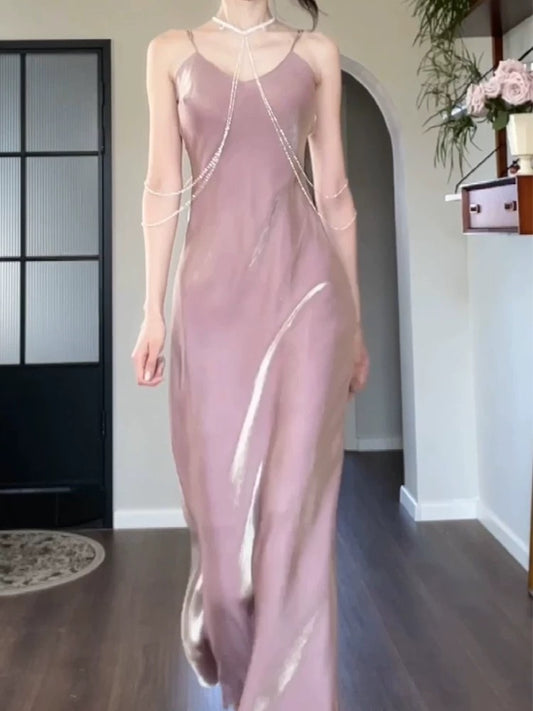 Jolie robe de bal longue rose à bretelles spaghetti C2369