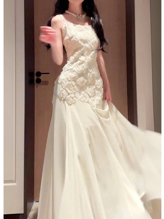 Jolies robes de bal longues en dentelle florale blanche à bretelles spaghetti sirène C2370