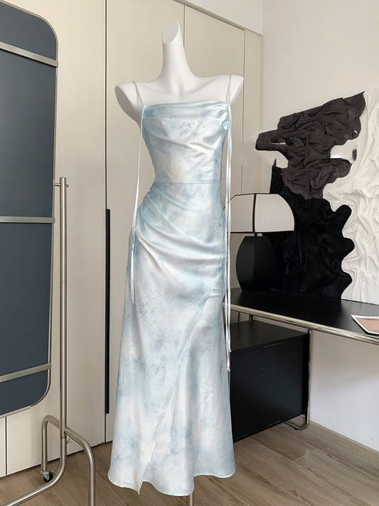 Robe de bal fourreau classique à bretelles spaghetti bleu ciel clair avec fleur C2478