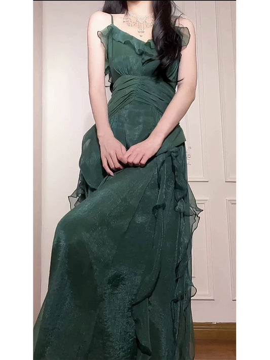 Robe de soirée sexy en mousseline de soie verte à bretelles spaghetti et ligne A C2344