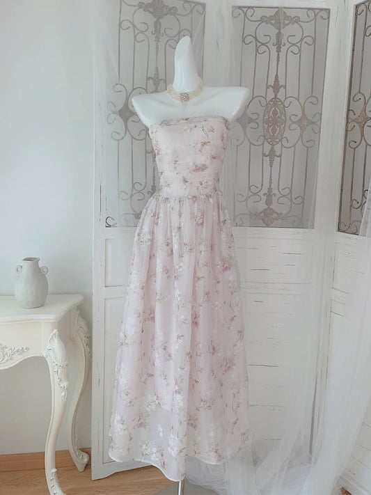 Robe de soirée sexy en mousseline de soie rose à fleurs et bustier en forme de A C2346
