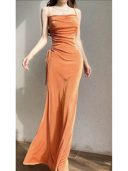 Robe de soirée longue en velours à bretelles spaghetti et fourreau modeste en organza C2305