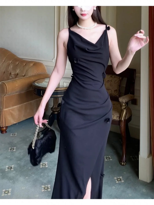 Robe de soirée longue noire à bretelles simples et fente C2471
