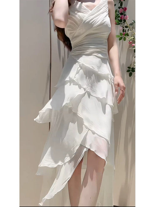 Robe de soirée modeste en mousseline de soie blanche à bretelles spaghetti hautes et basses C2311