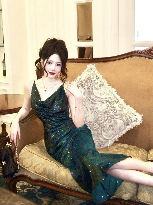 Robe de soirée fourreau modeste à bretelles spaghetti et paillettes vertes C2315