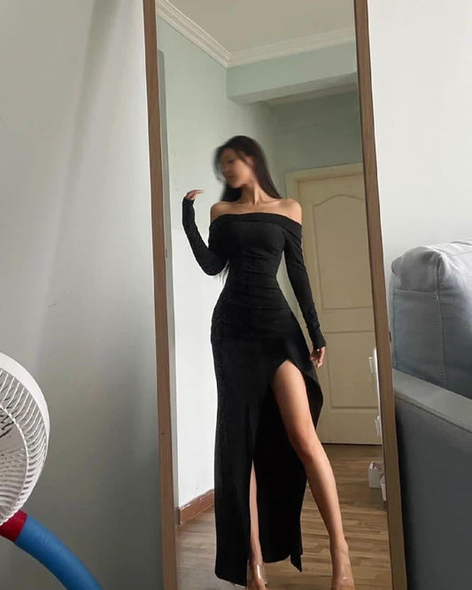 Robe de soirée longue noire à épaules dénudées et fourreau simple avec fente C2472