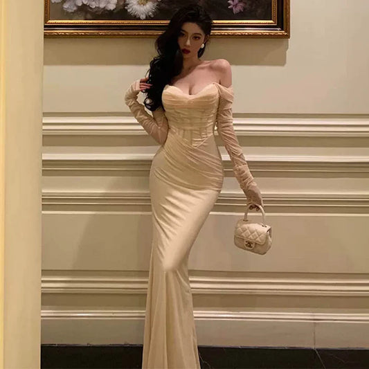 Robe de soirée longue en satin blanc et tulle à épaules dénudées et sexy pour sirène C2127