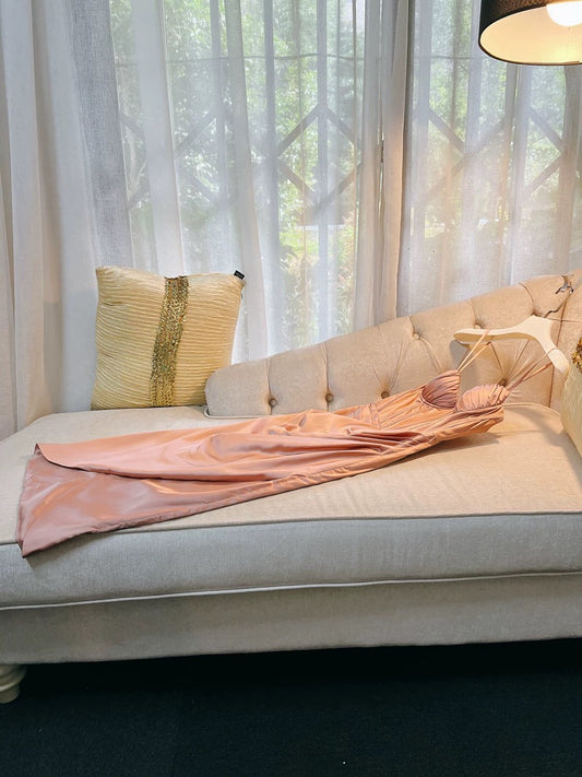 Robe de soirée longue en satin rose à volants et décolleté en cœur modeste C2008