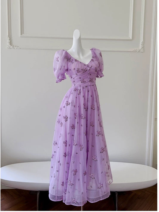 Robe de soirée vintage en tulle lilas à manches courtes et décolleté en V avec fleurs C1887