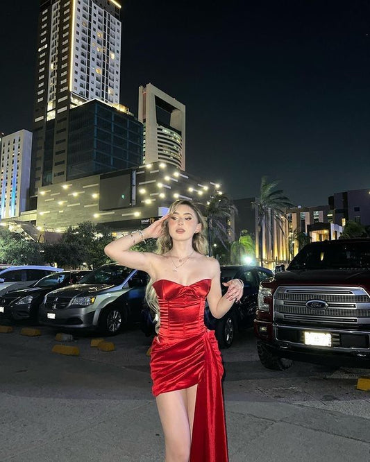 Robe de soirée courte plissée en satin rouge style sirène, sans bretelles, tenue pour 19e anniversaire, C4701